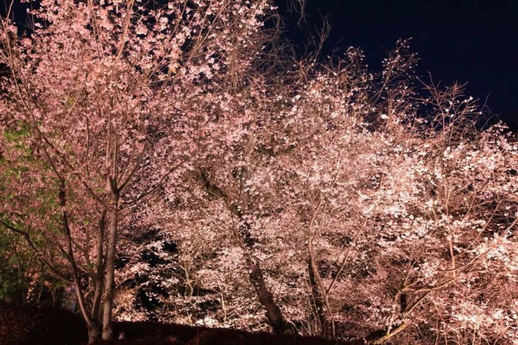 昼間は青空や周囲の山々に映える桜が美しく、夕暮れ時には夕日を浴びて幻想的な雰囲気に。夜にはライトアップも行われ、昼間とはまた違った表情の桜を楽しむことができます。