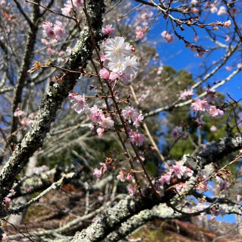 冬桜は「十月桜」とも呼ばれ、春の桜よりもやや小ぶりで可憐な花を咲かせるのが特徴です。晩秋から初冬の澄んだ空気の中に、淡い薄紅色の花が広がる光景はまさに幻想的。