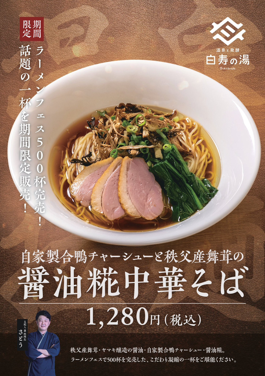秩父産の舞茸・ヤマキ醸造さんのお醤油・自家製合鴨チャーシュー・醤油糀を使用した『醤油糀中華そば』。