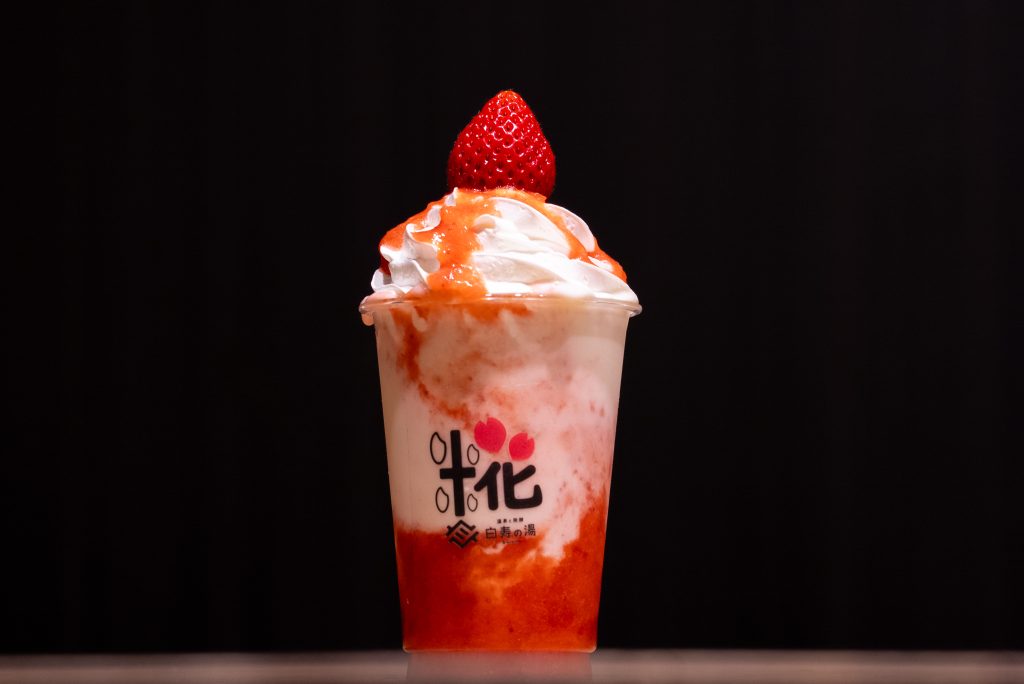 宝美いちごの人気メニューのストロベリースムージーを、白寿の湯ならではの糀シェイクとしてアレンジしました。